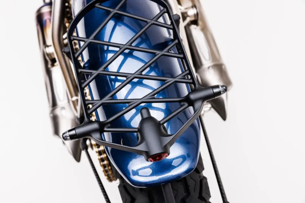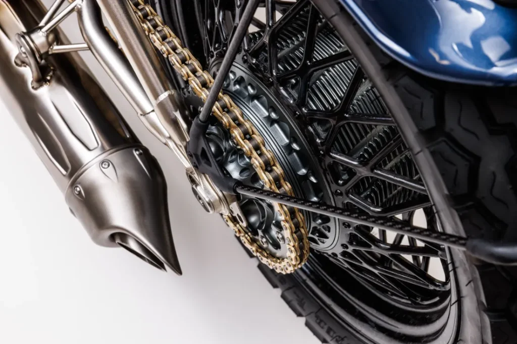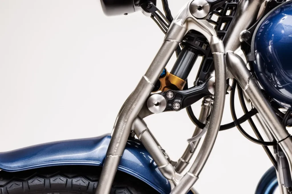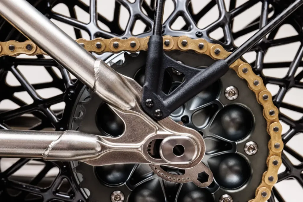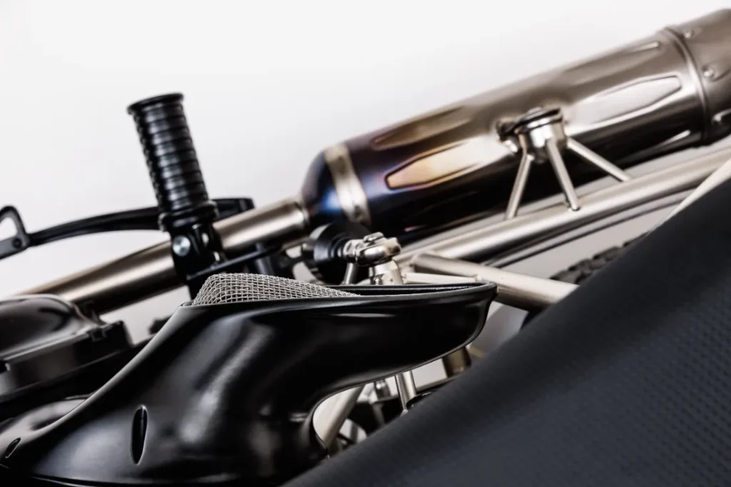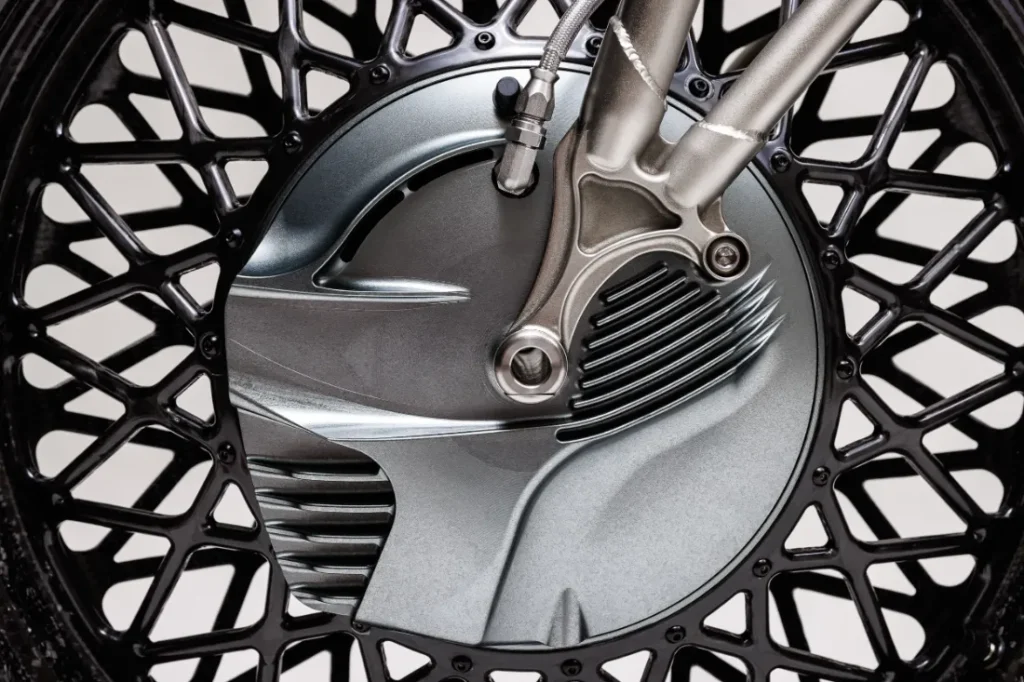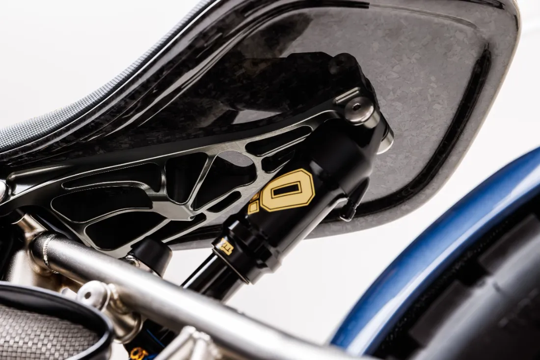 W całym projekcie zastosowano materiały o wyjątkowej jakości, takie jak stopy duraluminium, najwyższej klasy stal chromowo-molibdenowa, kute włókno węglowe i tytan. To właśnie tytan odgrywa tu główną rolę – z niego wykonane są śruby, oś, nakrętki i śruby ramy oraz silnika. Nie można też pominąć w pełni tytanowego układu wydechowego, zawierającego liczne elementy wydrukowane w technologii 3D. Większość elementów motocykla powstaje w procesie obróbki 5-osiowej, który wymaga ponad 300 godzin pracy maszyn na każdy egzemplarz.