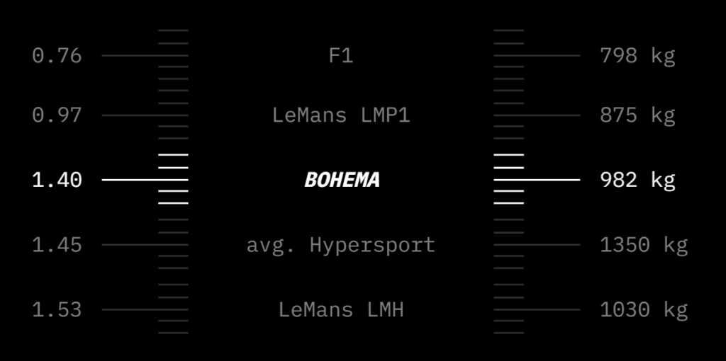 Choć stworzona z myślą o torze, Bohema pozostaje luksusowa i praktyczna. Wyposażona w klimatyzację, dopasowane schowki bagażowe, wysokiej jakości skórę lub Alcantarę oraz perfekcyjną ergonomię, zapewnia wygodę nawet dla dwóch wysokich dorosłych osób.